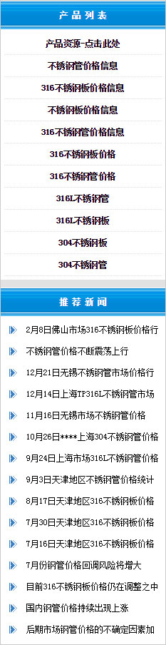 主營品種:不銹鋼管,不銹鋼板,不銹鋼棒,不銹鋼卷板,不銹鋼管件,不銹鋼方管,材質為304,304L,316,316L,321,310S,309,2520,2205,904l其中304不銹鋼板,304不銹鋼管,316不銹鋼管,316不銹鋼板長期有現貨供應,同時提供316不銹鋼板價格和不銹鋼管價格的價格資訊!